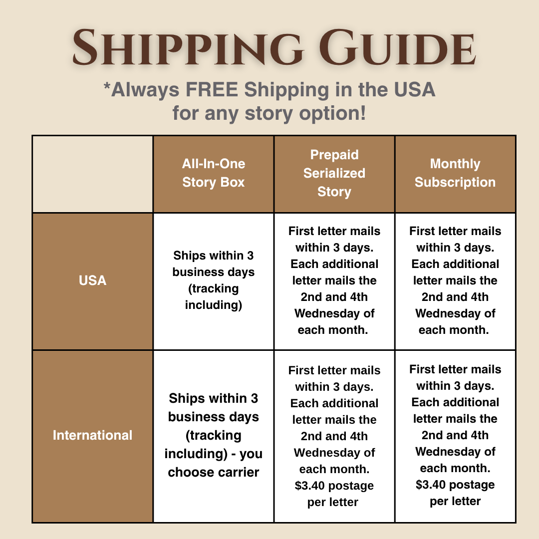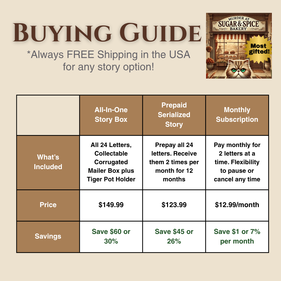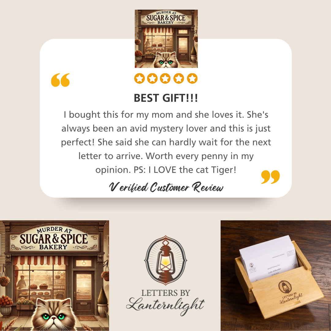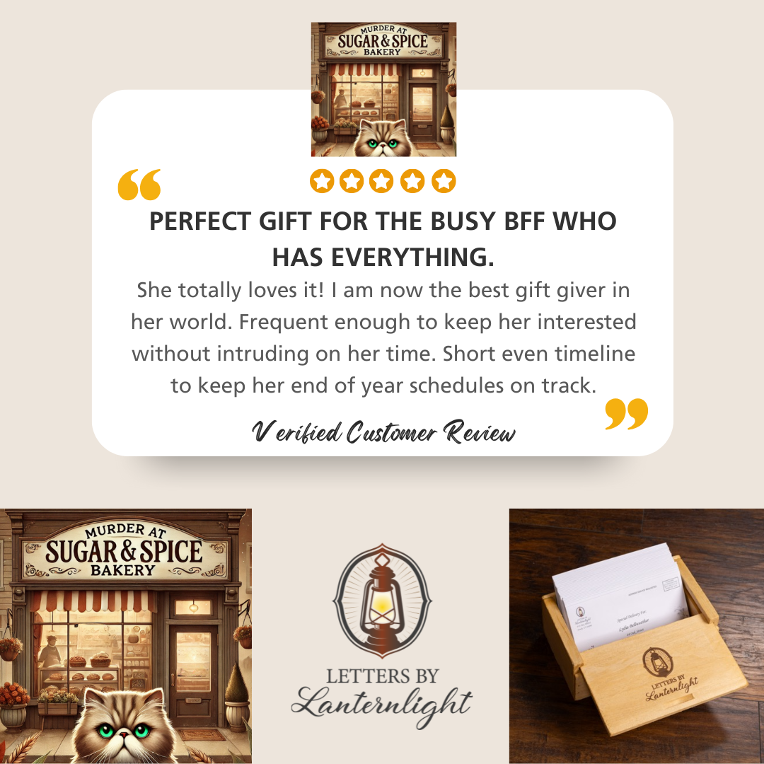 A snail mail cozy mystery delivered 2 times per month over 12 months